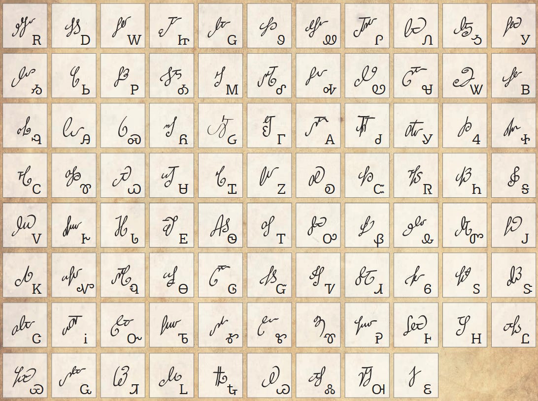 For example, the letter “A” in the Cherokee syllabary corresponds to “go” or “ko” and the letter “M” to “lu.” The Cherokee syllabary also uses syllables as a base unit (like hangul or katakana) rather than root phonemes, the result of which is that it includes 85 symbols.