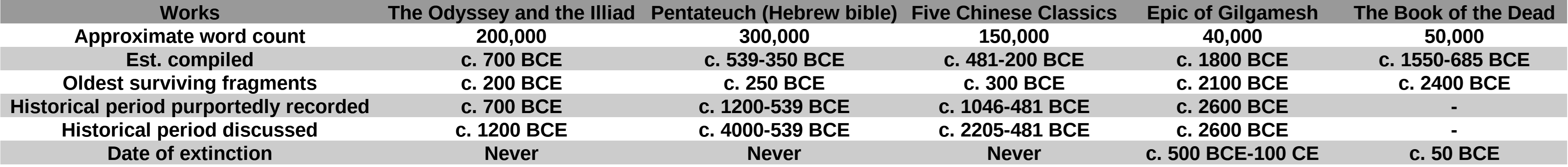 The Epic of Gilgamesh and the Book of the Dead are considerably older, representing the unearthed lost cultural heritage of the world’s most ancient known literate civilizations. There is no reason to call the Chinese classics a deeper and more ancient literary tradition than the Greek or Hebrew classics, though one could contend greater antiquity on the Western side on the basis of the influence of Sumerian and Egyptian culture on classical Greek and Hebrew work.15