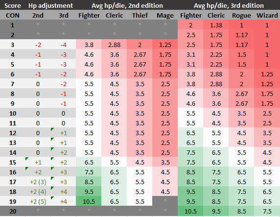 In 3rd edition, class became less important, and Constitution scores became more important. In 2nd edition, only warriors could earn more than two bonus hit points per die, and scores of 7-14 had no bonus or penalty.