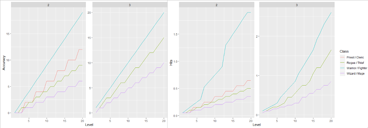 These effects on accuracy, rate of attack, and damage all combined to erase what had been a very large difference in total damage output. In 2nd edition, warriors, even warriors with low strength scores, were much better at killing monsters than non-warriors, especially after they hit 7th level. In 3rd edition, however, the average damage curves overlap signifciantly, even at high levels.