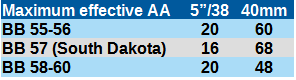 What this meant was that in theory, the South Dakota class was better protected in a gun duel with a peer battleship, but more vulnerable to Japanese aircraft, submarines, cruisers, destroyers, and torpedo boats, each of which was a more numerous threat. However, in practice, it’s not clear that the South Dakota class had more staying power in a gun duel with another battleship.